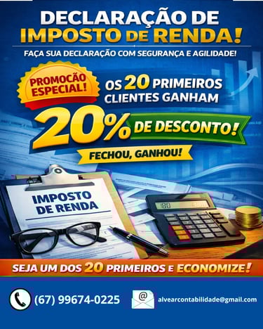 Os 20 primeiros clientes que fecharem a Declaração do Imposto de Renda com a Alvear Contabilidade garantem 20% DE DESCONTO 💰